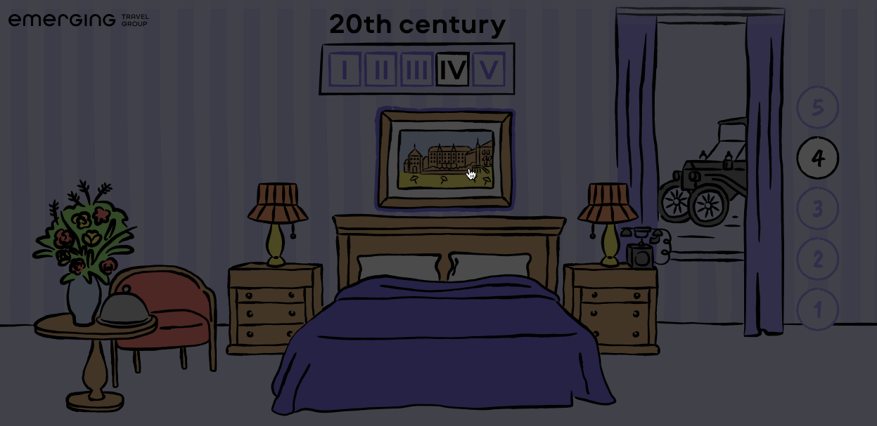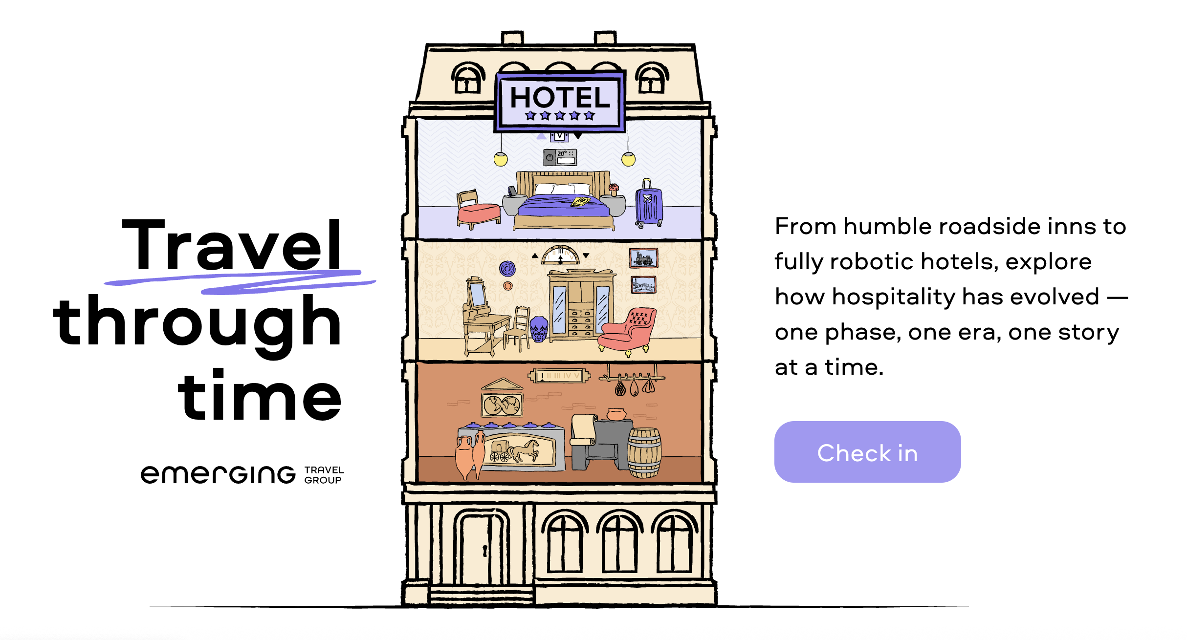 From the earliest roadside inns to today’s cutting-edge robotic accommodations, the Travel Through Time landing page takes you on a fascinating journey through the story of hotels, one era at a time. Don’t forget to click while you’re browsing the landing. There are many facts about ETG hidden in hotel rooms — find them all!