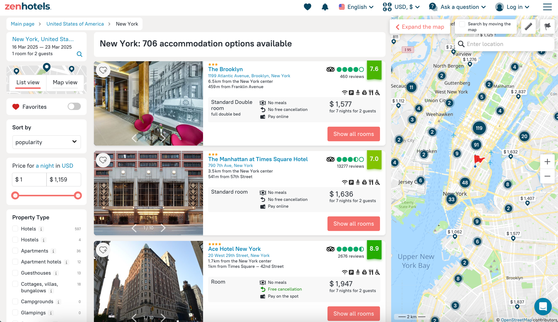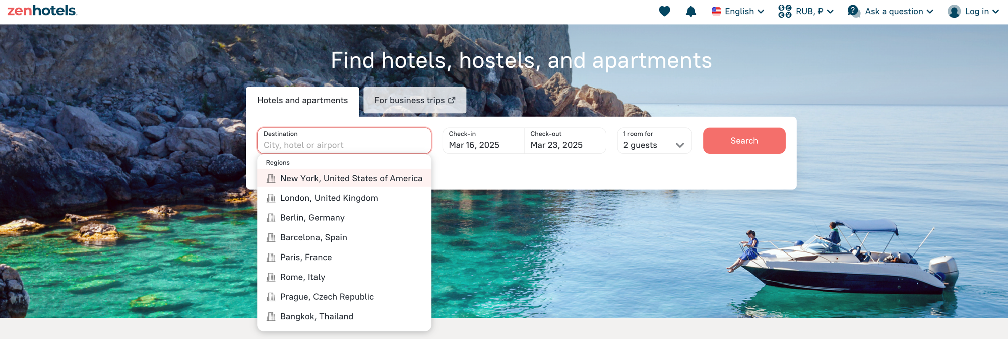 Booking starts with a search. The screenshot shows the main page of https://zenhotels.com. It is a hotel booking website for individual travelers that offers various accommodation options, such as hotels, hostels, apartments, guest houses, and campgrounds.